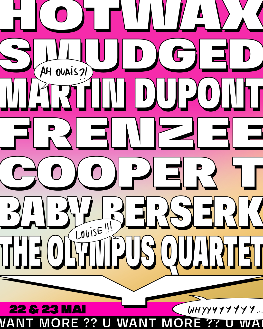 – samedi 23 mai 2026 : The Olympus Quartet, Y, shortstraw. , Lime Garden, Frenzee, Martin Dupont, Body Horror, Maquina. …